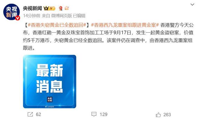 根据9月18日的闭路电视新闻,香港警方今天宣布,在9月17日在香港洪霍姆市的金和珠宝加工研讨会上进行了一场黄金抢劫,价值将近5000万美元的香港,所有被盗的黄金都被收回了。该案仍在调查中,随后是香港西九龙的犯罪小组。香港警方说,在9月17日上午,有10名男子突然摧毁了30至40岁的工厂,其中包括 - 标记的金吧,金砖和金色的粉末,总计65公斤,价值近5000万英镑的香港,并偷走了将近30,000个香港的现金,并离开了工厂。记者随后通知公司的老板,并致电警察帮助。香港警方说,所需的策划者和记者是冶金工厂的合作伙伴,并有一个普通的商业伙伴。有11人被捕到晚上。香港媒体在9月18日报道说,盗贼之后,该团伙驾驶工厂工作人员和其他人,锁上了门,离开了。工厂经理到达现场计算损失后,该公司的老板被抢劫,并于当天上午1??1点报警。警方在收到报告后迅速到达,封锁并审查了现场,并获得了跟踪研讨会,工业建筑和周围的公共场所进行PinVestingsing。初步调查后,该案被列为抢劫,损失仍然属于。此案之后是西九龙严重的犯罪小组,他们正试图追求涉及该案的人。广州日报报道说,澳大利亚新闻站的记者从洪k学到了ONG警方内部人士认为,17日在洪邦香港进行了一次重大抢劫。 17个黑帮偷了黄金,其市场价值将近5800万港元(约5,302万元),其中包括黄金粉和金颗粒。了解,香港警察现在已经收回了所有被盗的商品,目前有近5800万港元的市值,目前有7人被捕,但策划者正在运行,警方正在试图狩猎此案中涉及的其他人。案例场所是Hung Hom的Heyuan East Street的Fuhang工业大楼的一家黄金工厂。据记者说,有三个研讨会合作伙伴,其中一个从黄金银行那里获得了一批黄金,并将其带到了研讨会上进行黄金融化过程。另一个涉嫌成为此案的策划者的伙伴在得知新闻并决定冒险后变得贪婪。他在清晨安排了另外16个人进入研讨会并去除了在金粉和金颗粒中融化的所有巨大宝藏。在此期间,所有人都不被掩盖或武器。在此期间,许多员工在研讨会上吃饭和休息。他们目睹了许多携带金粉和金色颗粒的伟人,但是由于他们看到一个熟人带领她,所以他们认为它带有货物,因此他们不抗拒。后来,有人要求他们离开车间,锁上门,然后删除监视记录。图片来源:红星新闻目前,国际金价处于高水平。至于新闻稿,金点为每盎司3,666.6美元。经济新闻综合闭路电视新闻,Urban Express,Red Star News