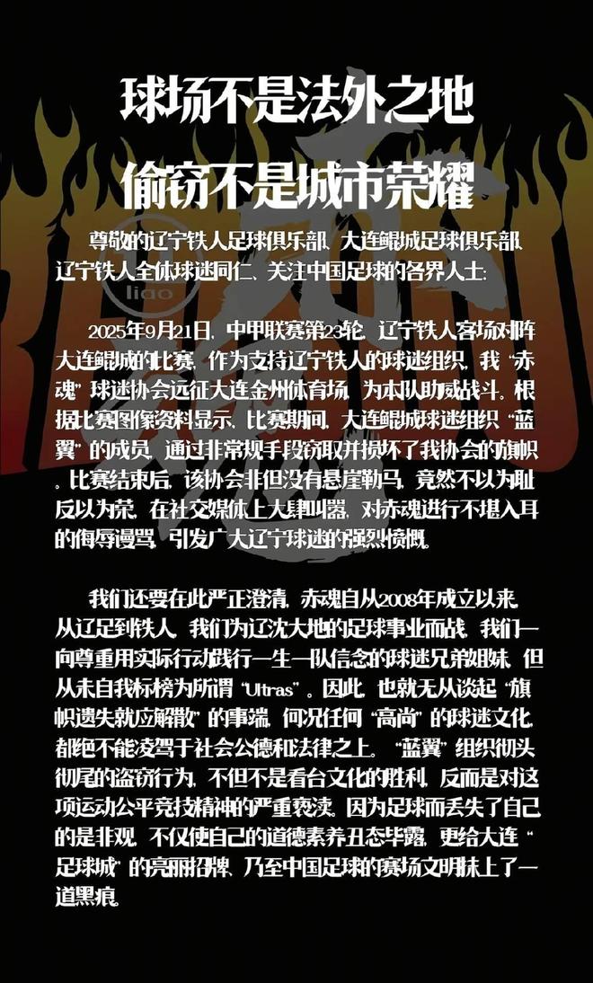 最近,借用钢铁侠“红色灵魂”粉丝协会发表了一份声明,称该组织的组织被达利安昆肯市的“蓝翼”粉丝组织盗窃和损坏。根据声明,在9月21日的借助钢铁侠游戏中,中国联赛第一联赛的达利安·昆肯(Dalian Kuncheng)在第23届中,达利安·昆肯(Dalian Kuncheng)“蓝翼”(Dalian Kuncheng“ Blue Wings”)粉丝组织的成员偷走了并损坏了“红色灵魂”的旗帜,在比赛之后,他们在社交媒体上也滥用了“红色灵魂”。 Chihun还说,自2008年成立以来,该组织从未声称自己是“ Ultras”。 SO称为“ Ultras”组织是指狂热和激进的粉丝组织。根据未编写的法规,如果超级组织的旗帜被敌对组织抓住(在中国,该法律称为“旗帜下”),则该组织必须将其解散。例如,STHE AC Milan Fan Ultras“ Fossa Dei Leoni”成立于1968年,其中两个它的旗帜在2005年10月9日与尤文图斯作战后被盗。当时,该组织的一些成员想与意大利国家警察合作以恢复横幅,而这种行为也将争议带入了该组织。后来,该组织的领导人宣布了组织的解散。一个月后,原始组织的大多数成员重新组织了“米兰南站”的粉丝组织。 “ Red Soul”拒绝了他是一个超级组织的说法,因此自然而然的是他没有办法谈论跌倒。他们还在一份声明中说:任何“贵族”的粉丝文化都不应克服道德和社会法。 “蓝翼”的行为不是站立文化的成功,而是公平足球比赛的亵渎。 “ Red Soul”要求“ Blue Wings”返回国旗并向公众道歉。如果拒绝恢复它,“红色灵魂”将使用法律方式来保护合法权利和兴趣和荣誉。